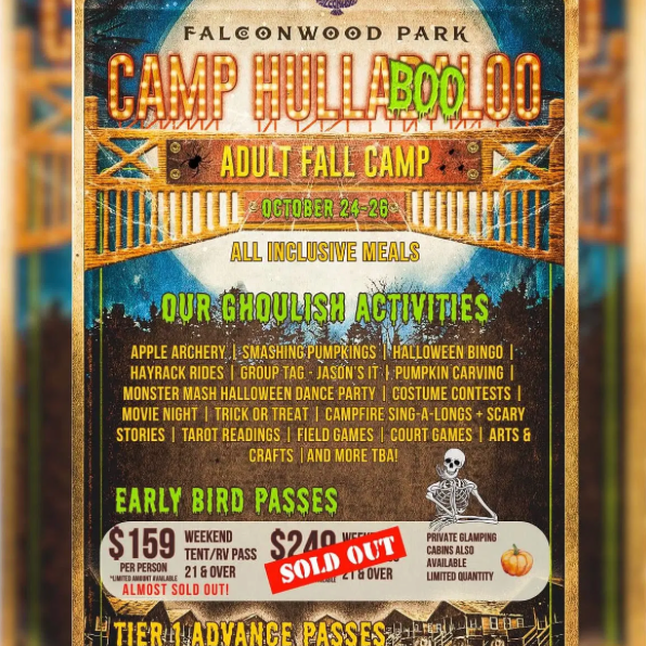 A Halloween-themed adult camp featuring spooky games, pumpkin carving, hayrack rides, and costume contests. It’s a festive weekend getaway for 21+ campers looking to mix fall fun with Halloween thrills 🎃