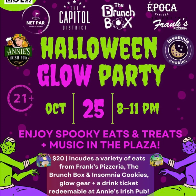 Get your glow on at The Capitol District’s Halloween Glow Party 🌟 Enjoy food from local favorites, a drink ticket, glow gear, live music, and glow-in-the-dark golf!