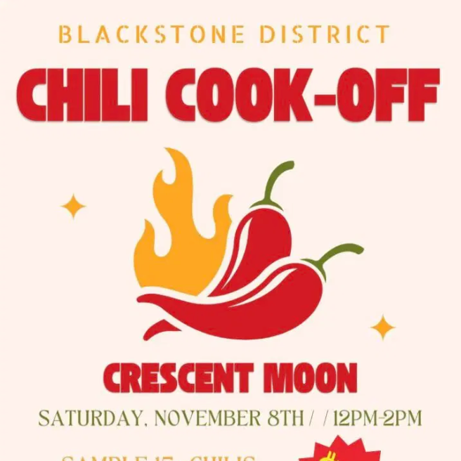 Warm up this weekend at the Blackstone Chili Cook-Off! 🌶 Sample chili from 15+ local businesses at Crescent Moon, vote for your favorite, and see who takes home the crown.