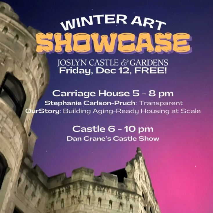 Explore two new art exhibitions and an end-of-year celebration at Joslyn Castle this Friday, featuring local artist Stephanie Carlson-Pruch and student design work from UNL. Free + all ages, with receptions from 5–10pm.