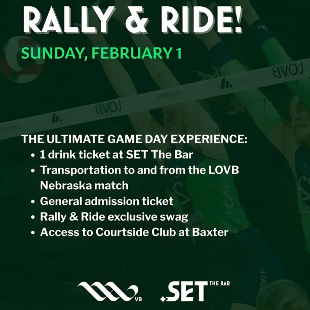 Rally & Ride is the ultimate game-day experience—start with a pre-game party at SET The Bar, then hop on the shuttle to cheer on LOVB Nebraska at Baxter Arena with fellow fans.